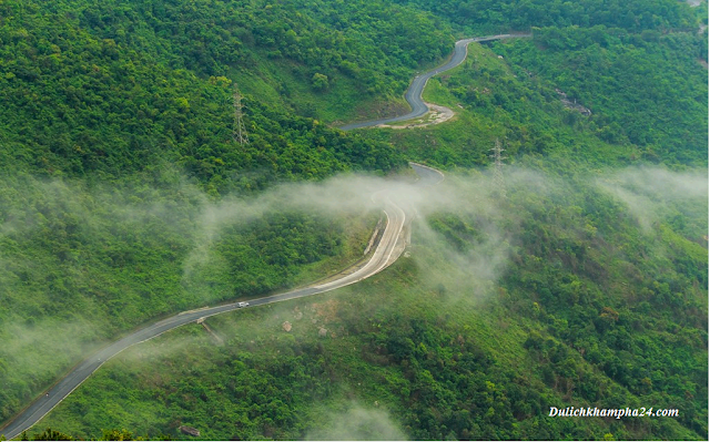 Trong khi đó, hướng mắt về phía Thừa Thiên – Huế, du khách sẽ thấy con đường ngoằn ngèo ở lưng chừng núi. Phía xa là những khóm mây bay lượn trên những ngọn cây.